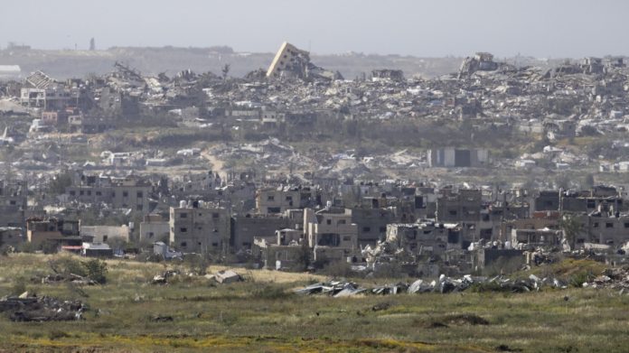 A view over ruined buildings in the northern Gaza Strip as seen from a position on the Israeli side of the border on April 2, southern Israel. Defense Minister Israel Katz has said Israel will “capture extensive territory” to be added to “buffer zones” in the Gaza Strip after the military expanded its ground assault.