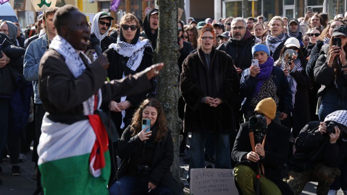 Demonstrators protest in Berlin against the possible deportation of four foreign pro-Palestinian activists from Germany on April 7. The four, including two from Ireland, one from Poland and one from the United States, face order to leave relating to their participation in a protest at Berlin’s Free University last year over Israel’s invasion of Gaza. City authorities have ordered the four to leave Germany or face deportation.