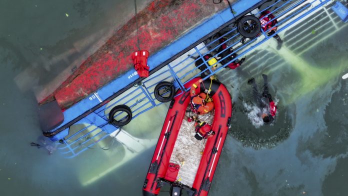 In this photo released by Xinhua News Agency, rescuers conduct a search and rescue operation at one of the two passenger boats capsized in Qianxi City, southwest China’s Guizhou Province on Monday, May 5, 2025.