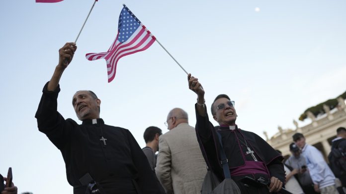 Clerics wave US flags during the speech of the newly elected Pope Leo XIV at the Vatican, Thursday, May 8.