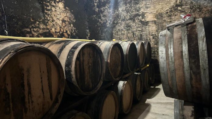 Champagne barrels line the deep, cool cellars of Charles Fourny’s estate in Vertus, France. Fourny says President Trump’s impending tariffs has taken away his trust in the U.S. market.