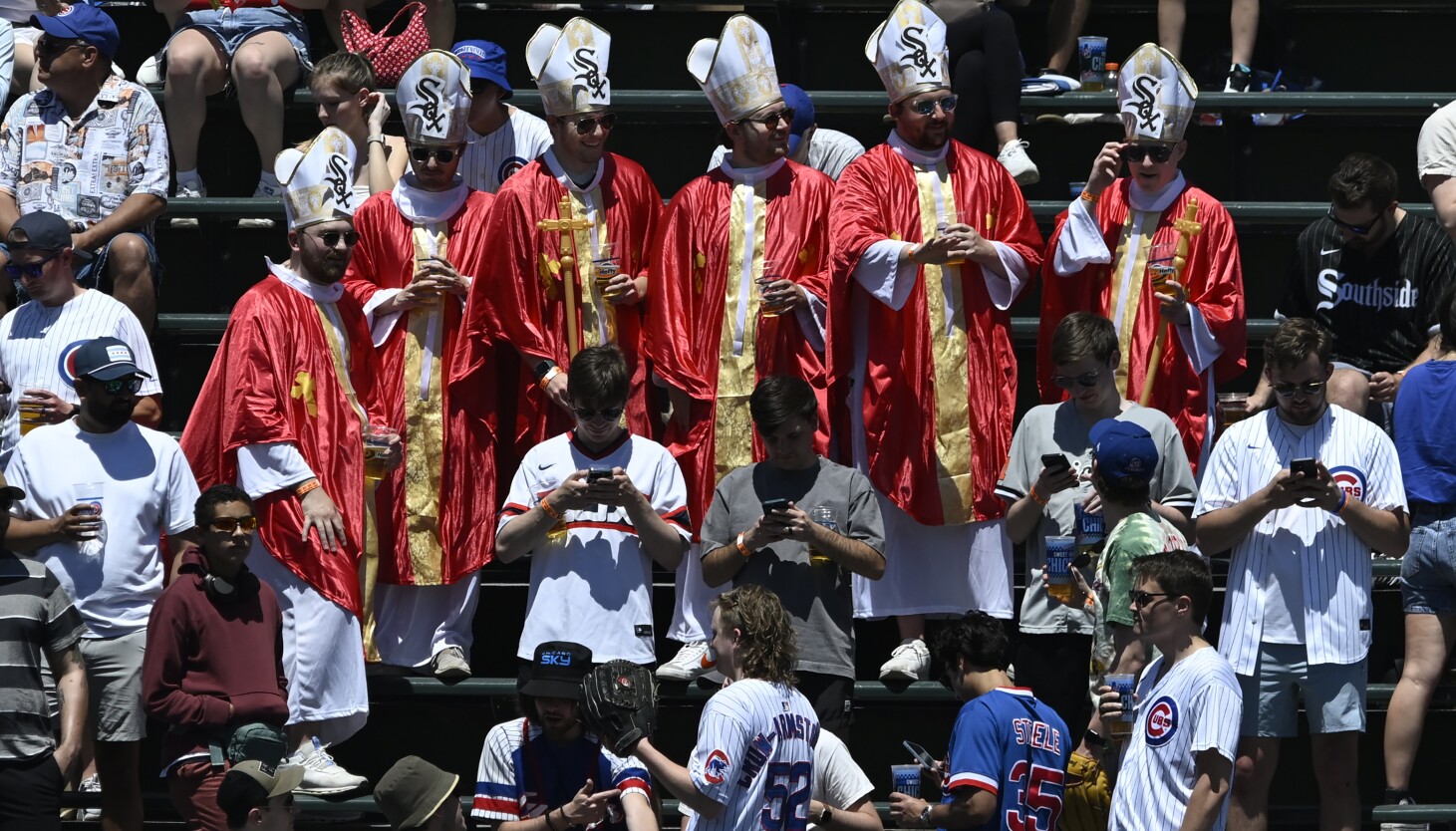 A group of White Sox fans dressed as the pope and watched a 13-3 loss to the crosstown Cubs from the bleachers at Wrigley Field on Friday afternoon.