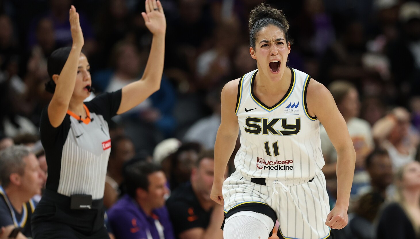 Newcomer Ariel Atkins was getting loose for easy buckets. Fellow newcomer Kia Nurse was pouring in threes, a glorious site after the veteran shooter’s 1-for-16 start to the season from long range. Point guard Courtney Vandersloot was in full command of her playmaking powers. Forward Angel Reese was in a fierce battle with Mercury star Alyssa Thomas, one of the WNBA’s most physical players, and holding her own quite well.