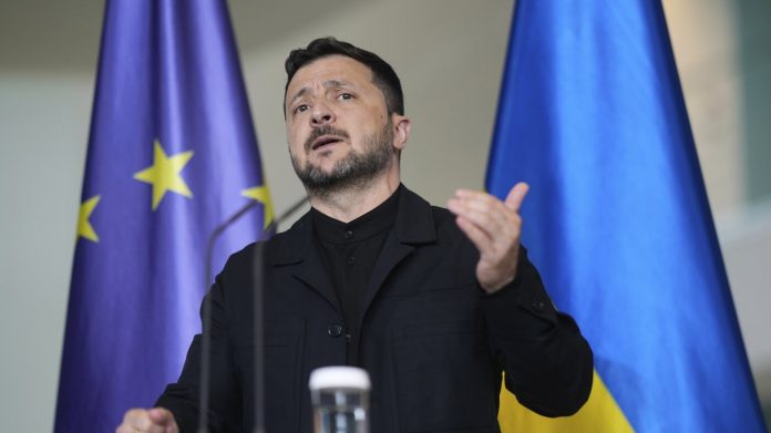 Ukraine’s President Volodymyr Zelenskyy gestures during a news conference at the chancellery in Berlin, Germany, Wednesday, May 28, 2025.