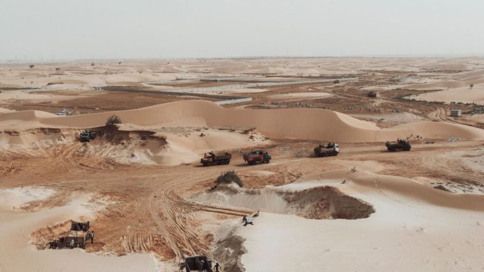 This aerial view show trucks loading sand from a quarry on the outskirts of Nouakchott, Mauritania, on March 14, 2023.