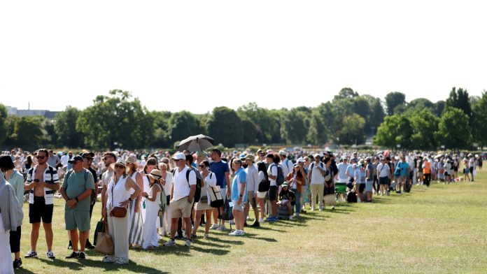 Spectators wait in the Queue on day one of Wimbledon, June 30.