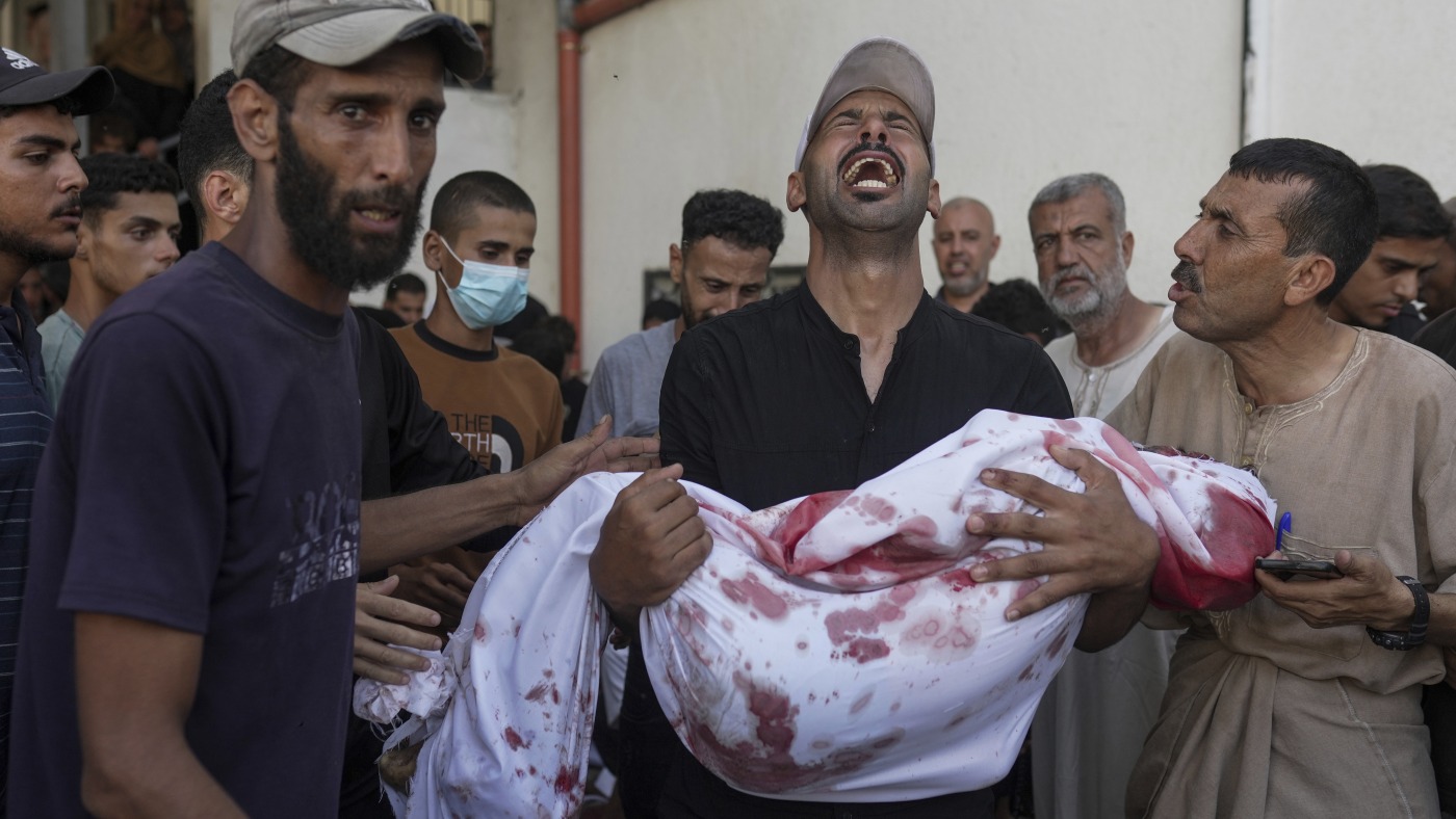 A Palestinian man carries the body of his child, who was killed in an Israeli military airstrike on Gaza, at Shifa Hospital in Gaza City, Saturday, July 12, 2025.