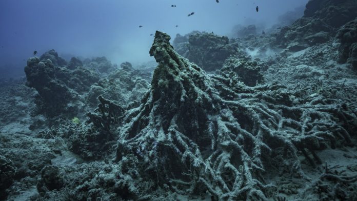 What remains of the “Tree of Life” on Sunday, July 20, 2025, is visible off the coast of Efate Island, Vanuatu, after being toppled by cyclones in 2023 and further damaged by an earthquake in 2024.