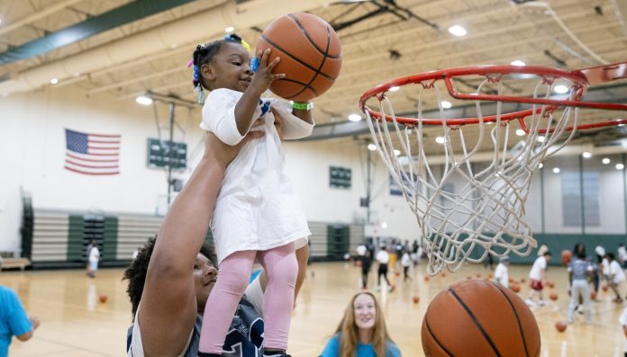 Children of incarcerated and formerly incarcerated parents were welcomed by volunteers from Prison Fellowship Angel Tree sports camp, running around the court at the Hope Student Athletics Center in Garfield Park.