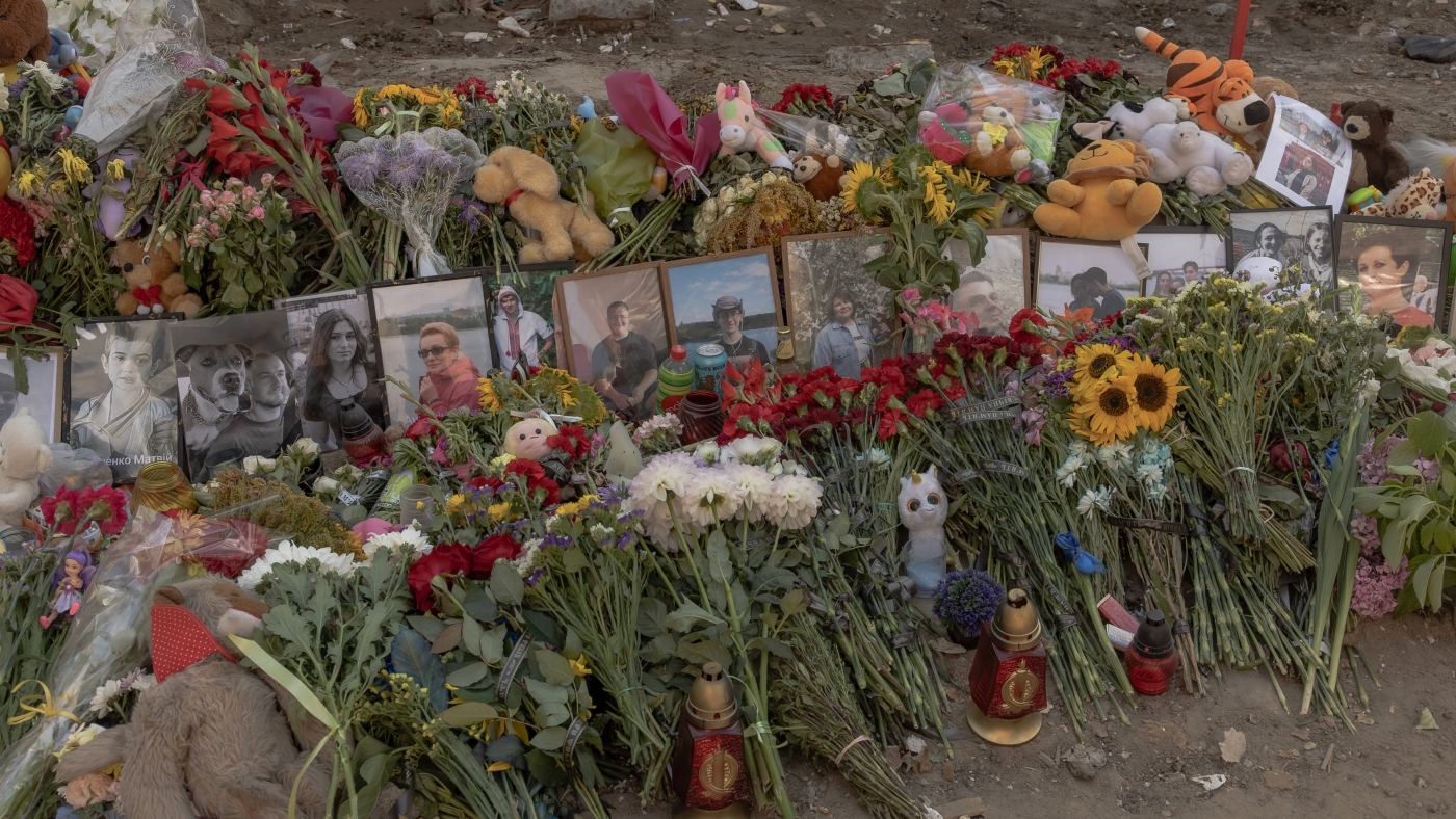 Ukrainians have made a makeshift memorial outside an apartment building in the capital Kyiv that was hit by a Russian airstrike on July 31. A combined missile and drone attack killed more than 30 civilians and wounded more than 150 in the city that day.