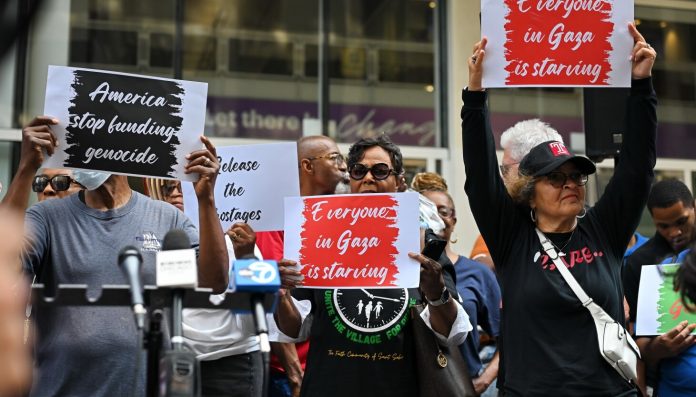 Members held protest signs that read “America stop funding genocide” and “Everyone in Gaza is starving” while leading prayers and sharing their message for peace. Some shared stories of people they lost, before and in the 22 months of the war that began with a Hamas-led attack on October 7, 2023.