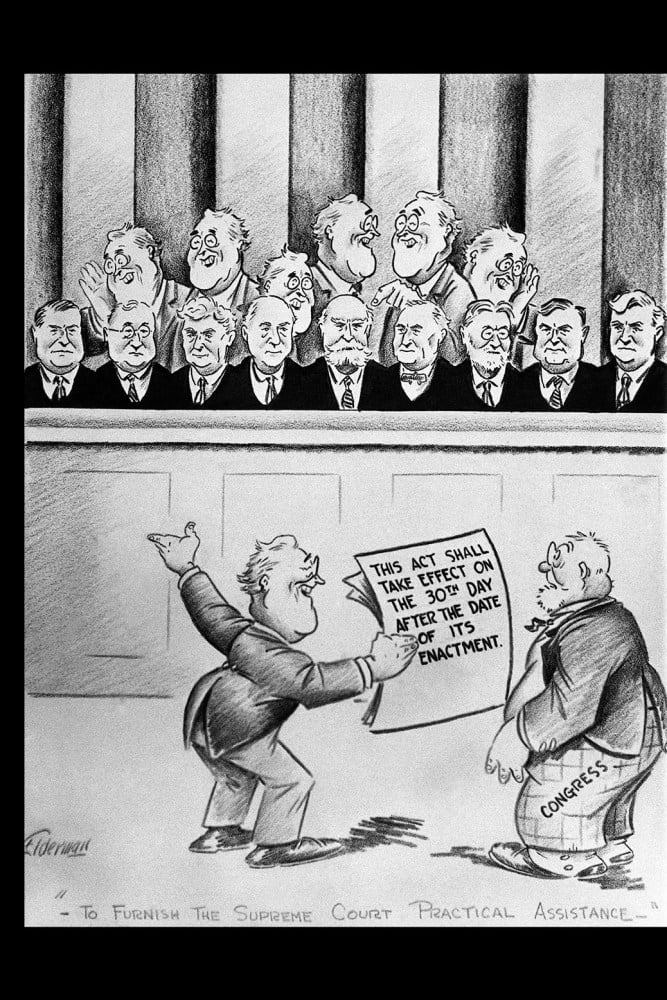A cartoon depicts Roosevelt’s 1937 Supreme Court-packing plan and opposition to it. J.N. “Ding” Darling via Getty Images
