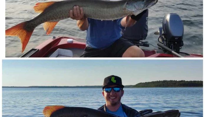 Adam Homa messaged one of those improbabilities of fishing, “My brother Chris Homa and I recently got back from a trip in Northwestern Ontario for fishing. On the way back we stopped in Bemidji and fished Big Lake for six hours on our way back to Chicago. I was lucky enough to catch a 47-inch musky. In 2023 we stopped at Big Lake and hired a guide [Kevin Cochran] to fish for musky and my brother Chris caught a 45-inch musky.” When looking at the two photos, Homa messaged, “I couldn’t help but notice the background in the two photos were obviously from the same spot in the lake. Same time of year. I started to look at similarities in the fish, patterns, markings. And realized this might be the SAME fish my brother caught in 2023.” He sent the photos to Cochran, who confirmed from multiple similar markings, it was the same fish.