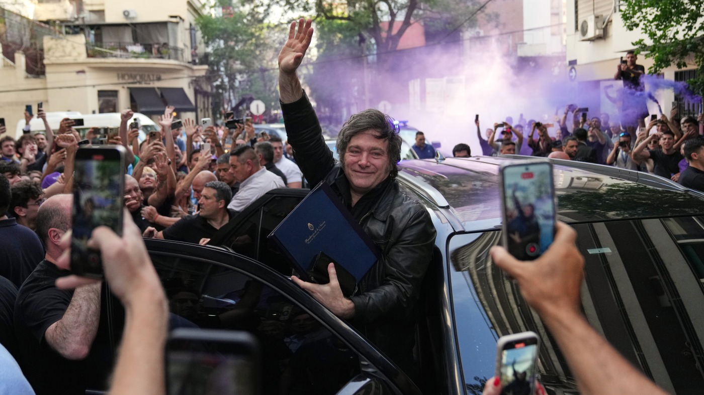 Argentine President Javier Milei waves to supporters upon arriving at a hotel in Rosario, Argentina, Thursday.