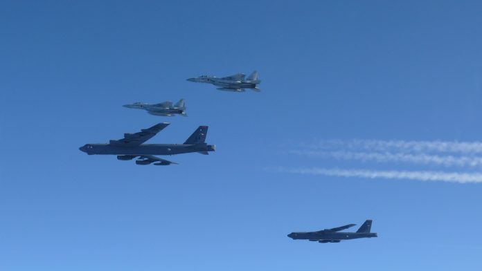 This photo provided by Japan’s Ministry of Defense shows the Japan Air Self-Defense Force’s F-15 fighters holding a joint military drill with U.S. B-52 bombers in the vicinity of Japanese airspace on Wednesday.
