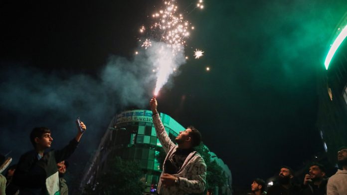 A man lights a flare during celebrations marking the first anniversary of the ousting of the Bashar al-Assad regime in Clock Square, Homs, western Syria, Monday.