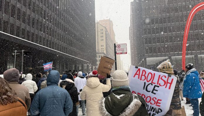 Hundreds of protesters, collectively angered after a second person was killed by immigration agents in Minneapolis, filled Congress Plaza and spilled out into the streets at Ida B. Wells Drive and Michigan Avenue in the Loop. Standing in the cold as snow fell, they repeatedly chanted support for immigrants and refugees and called for the abolition of the Immigration and Customs Enforcement agency.