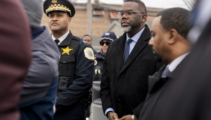 Mayor Brandon Johnson and the Rev. Michael Pfleger of St. Sabina Church, a longtime gun violence activist, and several other city officials and police gathered with members of the Auburn Gresham community for a prayer vigil and outdoor roll call Friday to show the community remains strong and resilient despite ongoing violence.