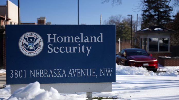The Department of Homeland Security sign is seen outside its headquarters on Feb. 13, 2026, in Washington, D.C.