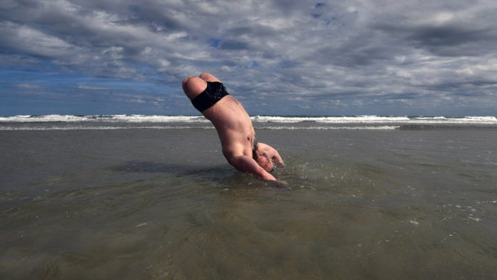 Sgt. Mykhailo “Misha” Varvarych, commander of Ukraine’s 80th Airborne Assault Brigade, delights in the ocean waters of Daytona Beach, Fla., on Jan. 28, 2023. For Varvarych, an amputee who received treatment and prosthetics in the United States, to live with joy and hope has become a weapon against war.