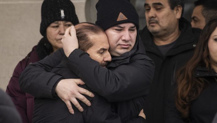 Ruben Torres Maldonado hugs family members and friends after the funeral for his 16-year-old daughter Ofelia Torres at St. William Catholic Church on the Northwest Side, Friday, Feb. 20, 2026. Ofelia, who successfully fought for her father’s release from federal immigration detainment, died last Friday after fighting metastatic alveolar rhabdomyosarcoma, a rare and aggressive form of soft tissue cancer, according to a news release.