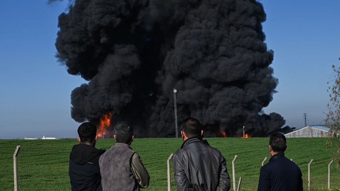 People watch as smoke billows from an oil warehouse in the Kani Qirzhala area on the outskirts of Erbil, the capital of Iraq’s autonomous Kurdistan region, following a suspected drone strike, on April 1, 2026.