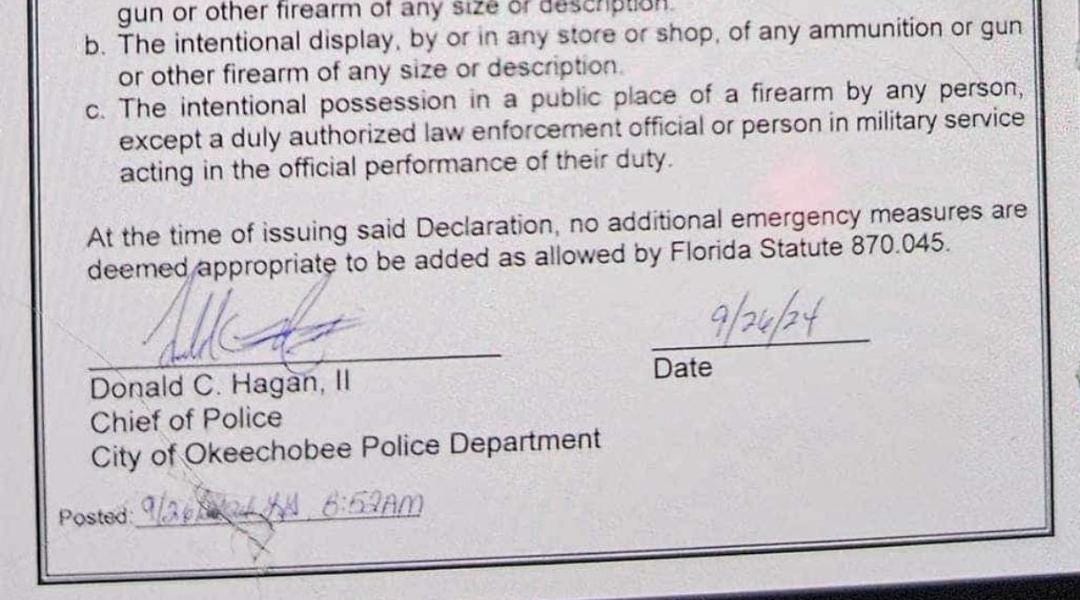 The City of Okeechobee, Florida adopted an illegal ordinance shortly before Hurricane Helene made landfall last week, which banned the sale of guns and ammunition and prohibited firearm possession in public by anyone other than law enforcement or members of the military.