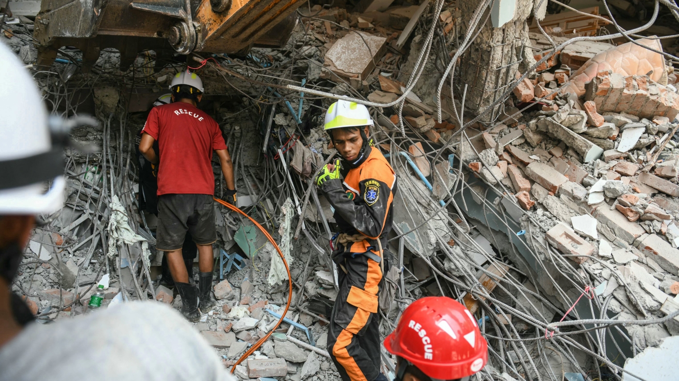 Rescuers search through the rubble of a damaged building looking for survivors in Mandalay on March 29, 2025, a day after an earthquake struck central Myanmar.