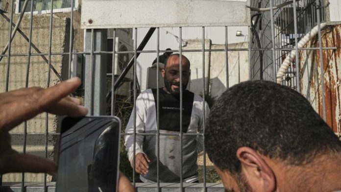 Hamdan Ballal, Oscar-winning Palestinian director of No Other Land, is released from a police station in the West Bank settlement of Kiryat Arba a day after being detained by the Israeli army following an attack by Jewish settlers, on Tuesday.