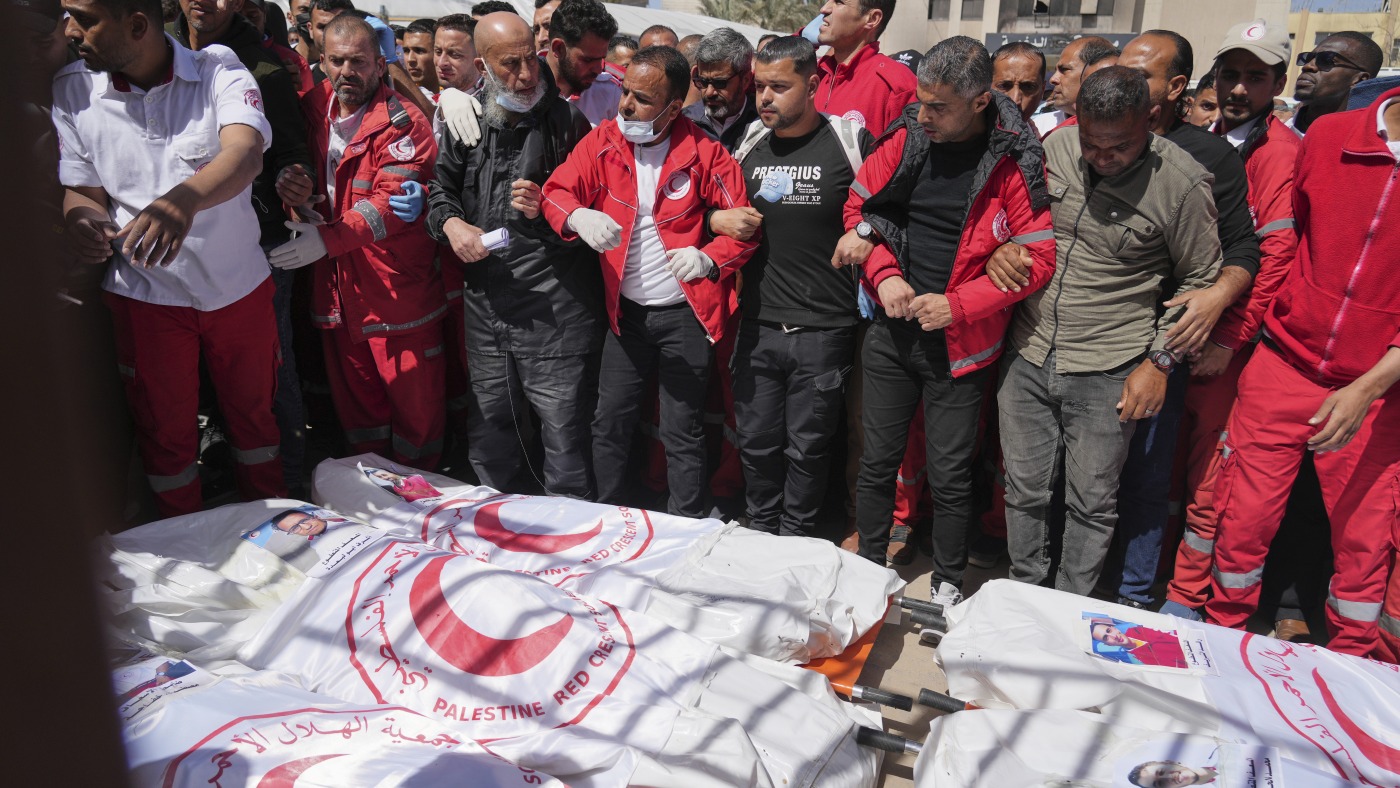 Mourners gather around the bodies of eight Red Crescent emergency responders, recovered in Rafah a week after an Israeli attack, as they are transported for burial from a hospital in Deir al-Balah, Gaza Strip, March 31.