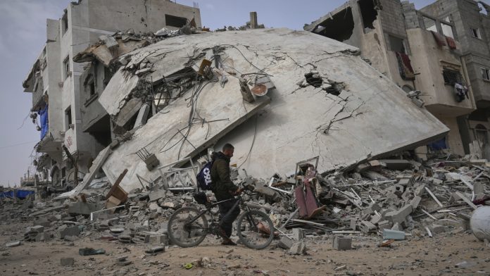 A man passes by the destroyed house of journalist Islam Meqdad, where she was killed along with her son and five other family members in an Israeli army strike in Khan Younis, southern Gaza Strip, Sunday, April 6, 2025.